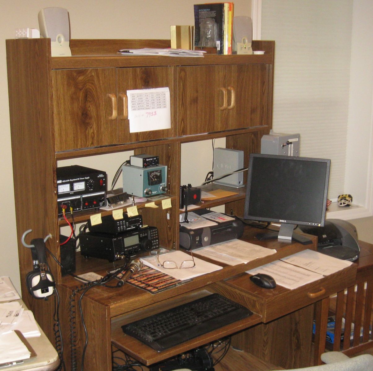 I have made do with this computer desk we purchased from the Habitat for Humanity recycling center. For $26 it will leave me money for other more important things. My Heathkit HW101 has been replaced with the ICOM 718. |